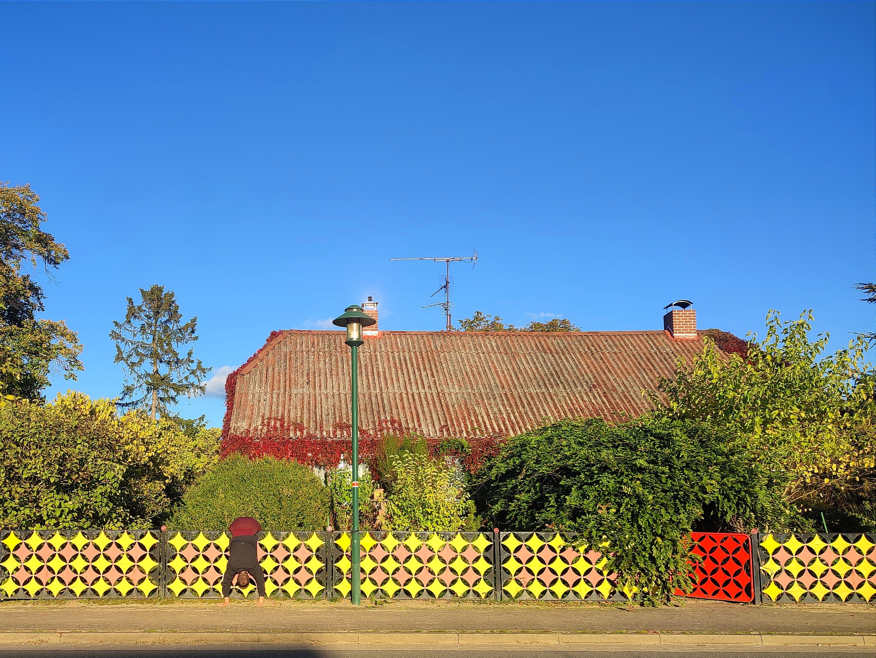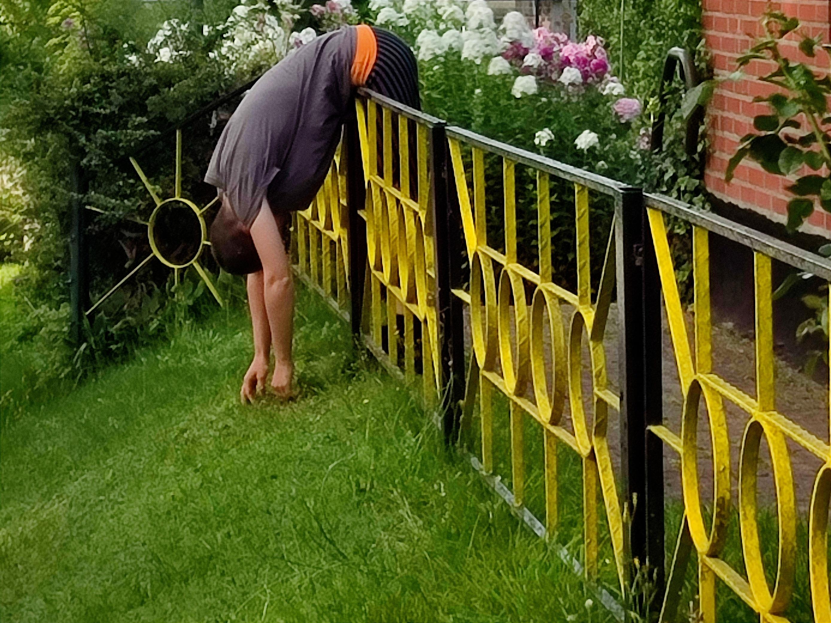 „Hier sieht man das Christuskreuz im Zaun. Das entspricht uns, dachten wir. Den Zaun hat damals ein Bekannter gemacht, der immer Metallarbeiten angefertigt hat. Er fragte, ob wir einen Zaun gebrauchen könnten und wir sagten ja. Der Zaun ist bestimmt 45 Jahre alt. Wir mögen auch das Japanische – daher die roten Kuller oben auf dem Zaun.“